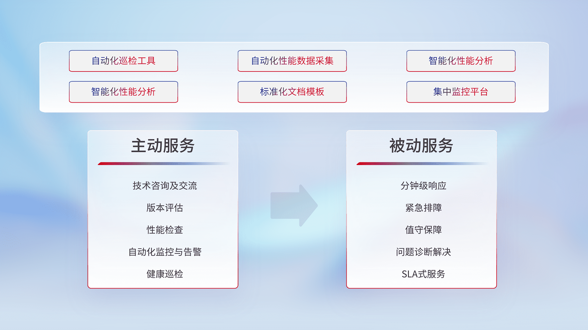 智能化工具和标准化文档,,,保障服务质量,,,,提供主动服务(包含技术咨询、、版本评估、、、、性能检查、、自动化监控与告警、、、、健康巡检)和被动服务包含(分钟级响应、、、、紧急排障、、值守保障、、、、问题诊断解决、、、SLA服务)。。